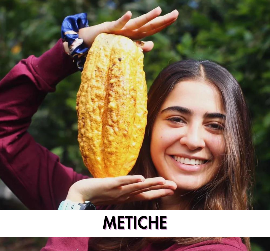 Based in Guadalajara, Metiche is dedicated to sharing Mexico's pre-Hispanic heritage through chocolate, as both a sensory and visual experience. Their packaging features traditional calligraphy and an emblem depicting a woman with a cocoa plant, symbolizing chocolate's origins in the area. Fabiola, the founder, meticulously sources all her ingredients - including cacao beans, sugar, cocoa butter, inclusions, and even printed packaging - from within Mexico, aiming to keep that money circulating in the local economy. Metiche works directly with farmers in Tabasco and Chiapas, visiting both the farmers and their farms regularly. The name "Metiche," meaning "nosy" in Spanish, reflects the Mexican culture's curiosity and desire for connection. Metiche believes that sharing chocolate is a way to foster meaningful connections and conversations, inviting others to join in the joy of discovery and indulgence.