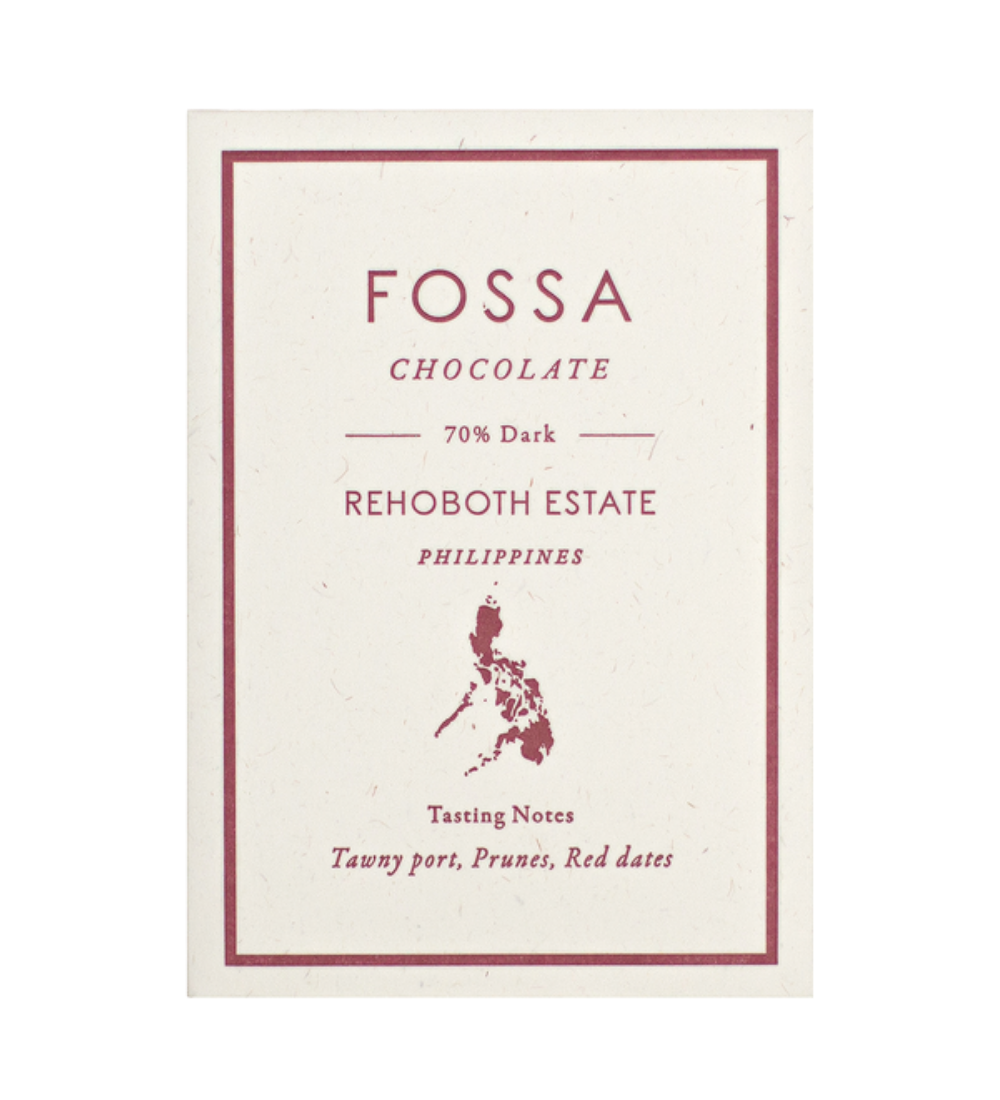 A single estate chocolate sourced from Rehoboth Estate located in the Calinan district in Davao City, Philippines. Fossa separates out the fruit from old native trees which, while they produce smaller pods and beans, are said to provide more powerful and alluring flavours. I believe it! A light roast profile showcases the beans' impressively rich nuances of dates, figs, prunes, and port. The chocolate coats the entire palate and leaves a chewy, lip-smacking mouthfeel.
