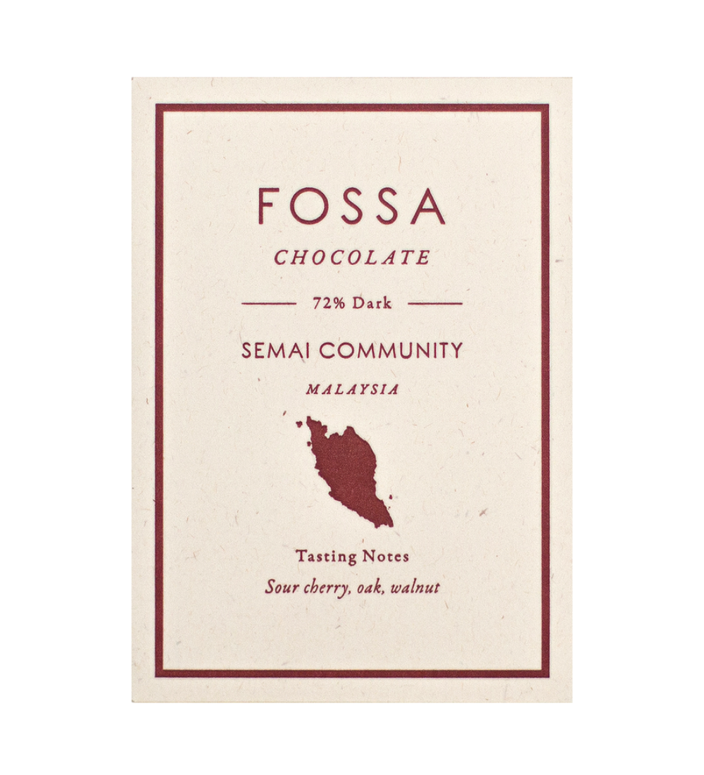 This bar is made from the November 2020 harvest of the Semai Orang Asli community of Kampung Long B in Pahang, Malaysia. Their cocoa is grown pesticide-free in a holistic agroforestry method that preserves surrounding biodiversity. The beans are fermented in used whisky oak barrels for 6 days with 3 turns in between. They are then dried on raised wooden beds in an enclosed greenhouse. The resulting bar has the composure, confident modesty, and strength of character of a wise old man. At once delicate yet firm, it offers an array of flavours that include gianduja, port, dates, pistachio, and coffee.