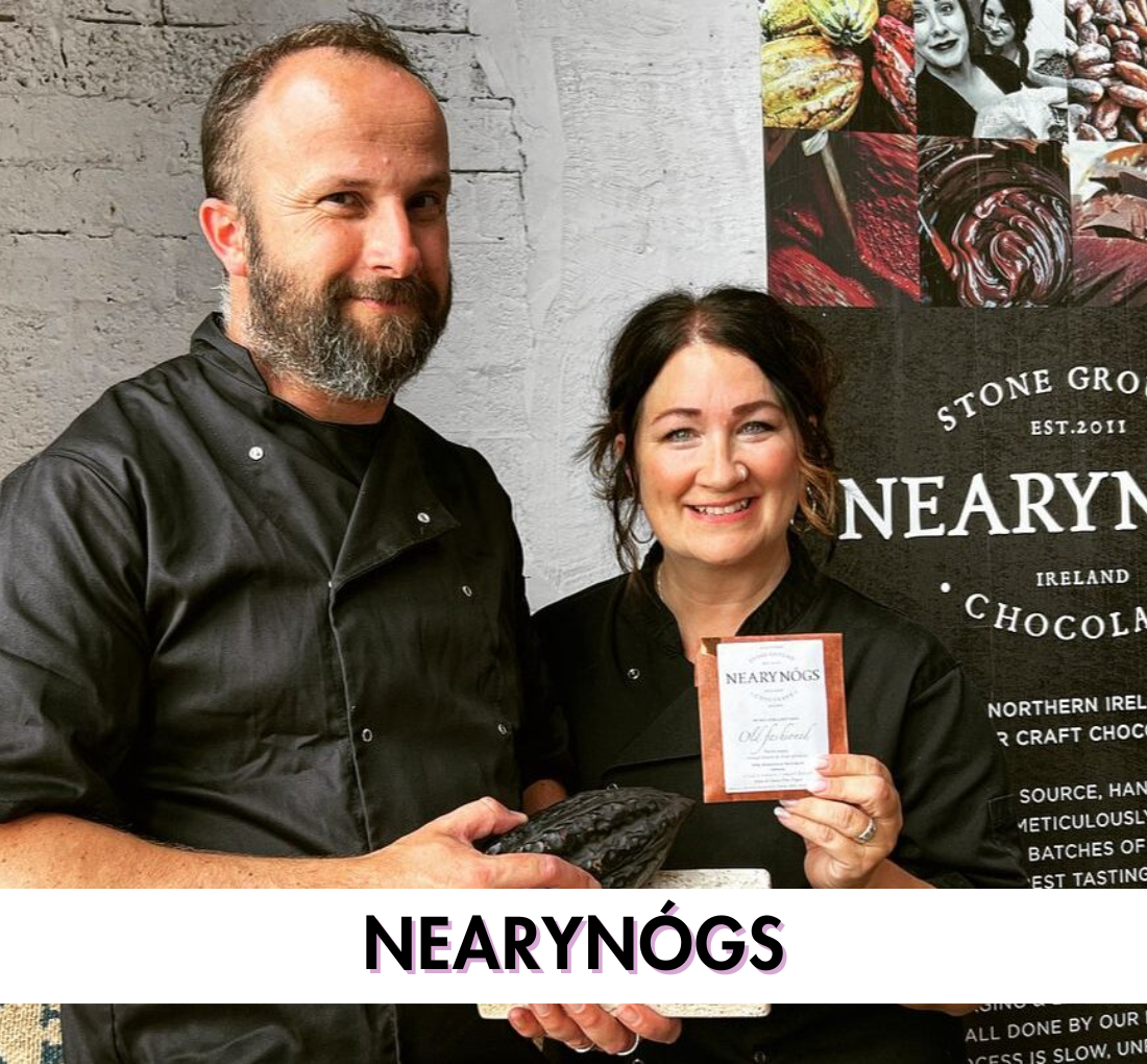 NearyNógs, Northern Ireland's first craft chocolate maker, began in 2011 as a family venture to fund a charity trip for the Neary family's eldest daughter. What started with a traditional family fudge recipe soon evolved toward bean-to-bar chocolate. Set amongst the beautiful countryside of County Down, overlooking the Mourne coast, husband and wife team of Dorothy and Shane craft ethically sourced, single origin chocolates in a solar powered facility. People can visit and enjoy a hot chocolate, coffee or tea in their cafe. Even though the beans come from across the world, NearyNogs has frequently experimented with unique flavour combinations inspired by their roots in Northern Ireland like locally-sourced gorse flower, seaweed, and lavender. The name “NearyNógs” is inspired by the whimsical stories Shane’s father would tell him and his sister as children, Neary being the family name and Nógs stemming from the old Irish term Tír na nÓg, or “Land of the Young.”